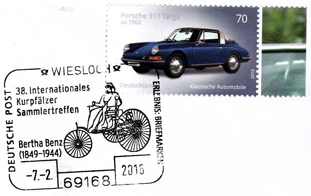 Sonderstempel aus Wiesloch vom 7.2.2016 mit dem Patentmotorwagen Nr. 1 von Carl Benz mit seiner Frau Bertha Benz im Stempelbild.