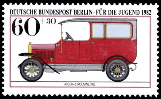 Auf der Jugendmarke 1982 zu 60+30Pf aus Berlin (MiNr 662) ist eine Adler-Limousine aus dem Jahre 1913 abgebildet.