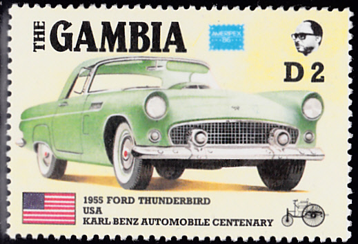 Auf dieser Marke aus Gambia (MiNr 630) wird ein Ford Thunderbird Baujahr 1955. Es ist ein zweisitziges Sportcabriolet mit einem Hardtop. Seine Spitzengeschwindigkeit betrug 180 km/h.