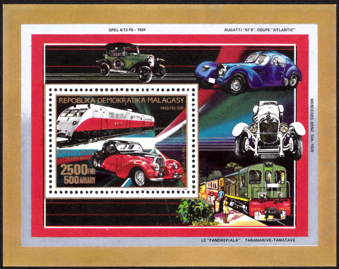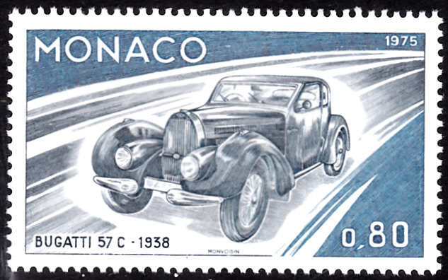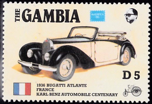 Auf dieser Marke aus Gambia (MiNr 632) sehen wir einen Bugatti Modell Type 57 SC, Coupé Baujahr 1936 Cabriolet.