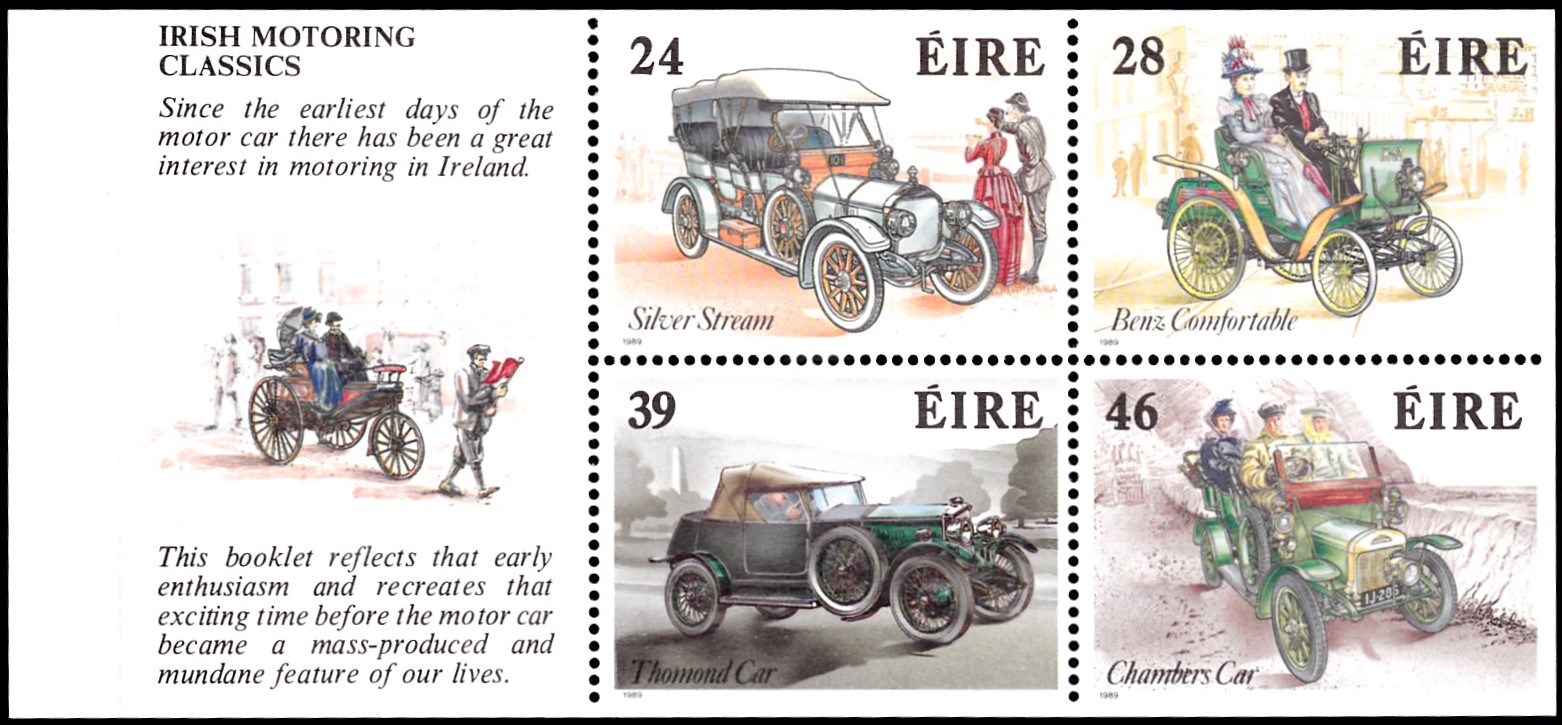 In einer Serie "Irisches Verkehrswesen Historische Automobile" erschien in Irland eine Marke (MiNr 674) mit einem Chambers. Hier zeigen ich eine zweiseitig gezähnte Marke aus einem Heftchen (MiNr 671 E).