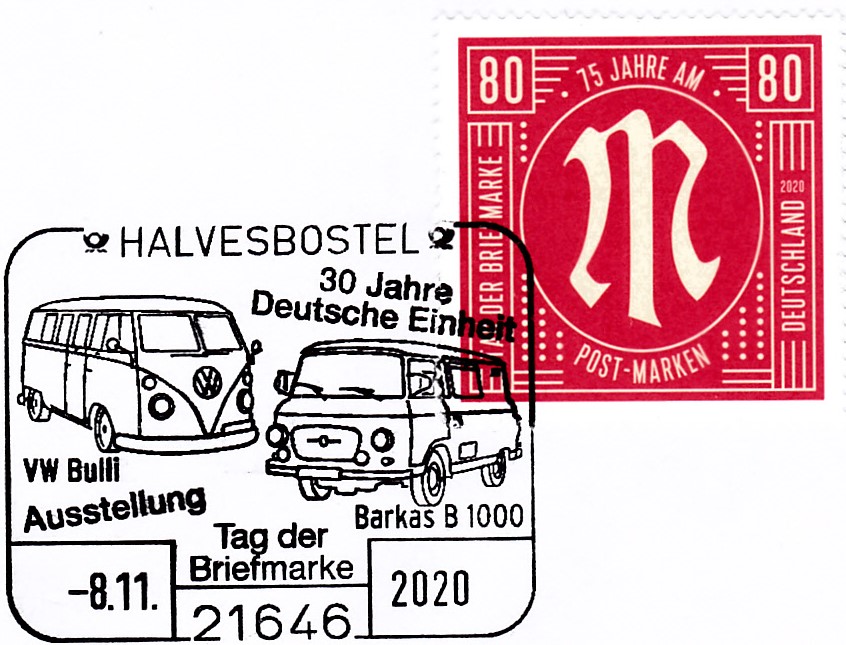 Im Sonderstempel zum Tag der Briefmarke 2020 vom 8.11.2020 aus Halvesbostel ist ein Barkas B 1000 abgebildet.