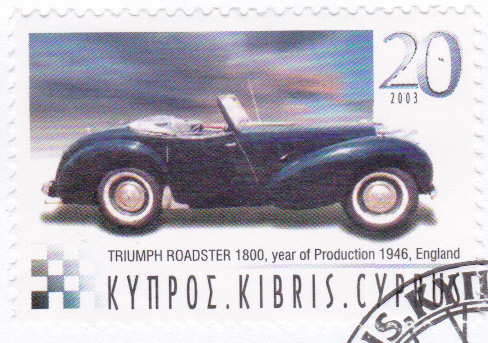 Auf dieser Marke aus Zypern wird der Triumph Roadster 1800 aus dem Jahre 1946 vorgestellt.