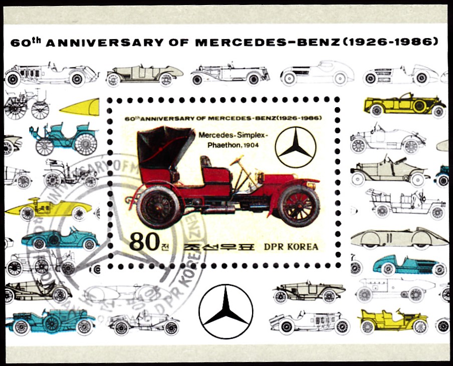 Die Marke in diesem Block aus Nord-Korea (MiNr Block 214 mit Marke MiNr 2744)m zeigt einen Mercedes-Simplex-Phaeton aus dem Jahre 1904.