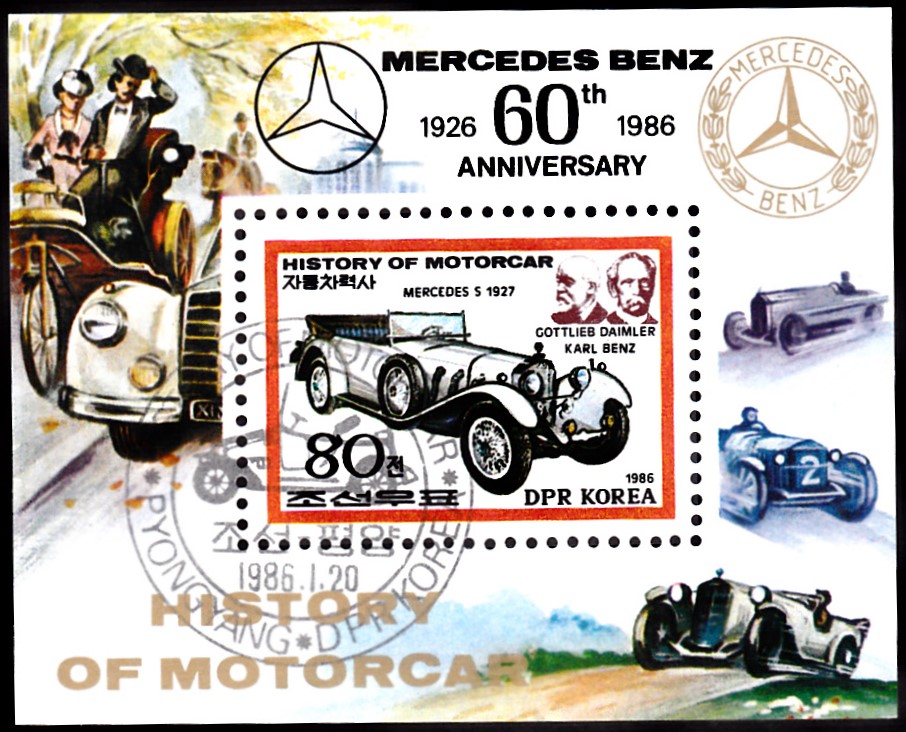 Die Marke in diesem Block aus Nord-Korea (MiNr Block 211 mit Marke MiNr 2718) zeigt einen Mercedes-Benz Typ S aus dem Jahre 1927.