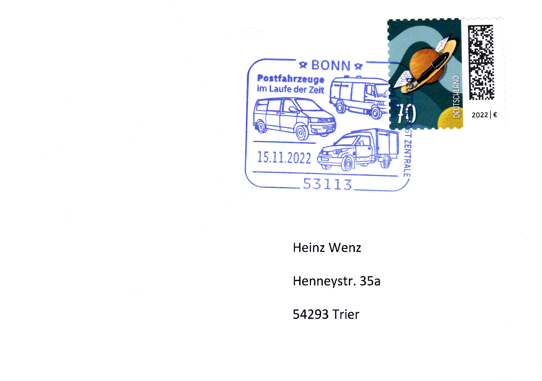 Auf diesem Sonderstempel aus Bonn vom 15.11.2022 ist rechts unten ein SteetScooter Work der Deutschen Post abgebildet.