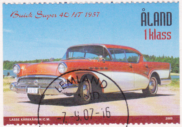 Auf einer Marke der Alandinseln (MiNr 249) ist ein Buick Super 4D HT aus dem Jahre 1957 abgebildet.