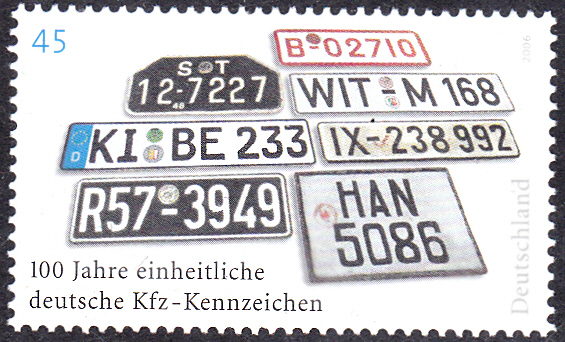 Aus Anlass "100 Jahre einheitliche deutsche Kfz-Kennzeichen" erschien bei der Deutschen Post eine Marke (MiNr 2551) mit Autokennzeichen aus verschiedenen Epochen.