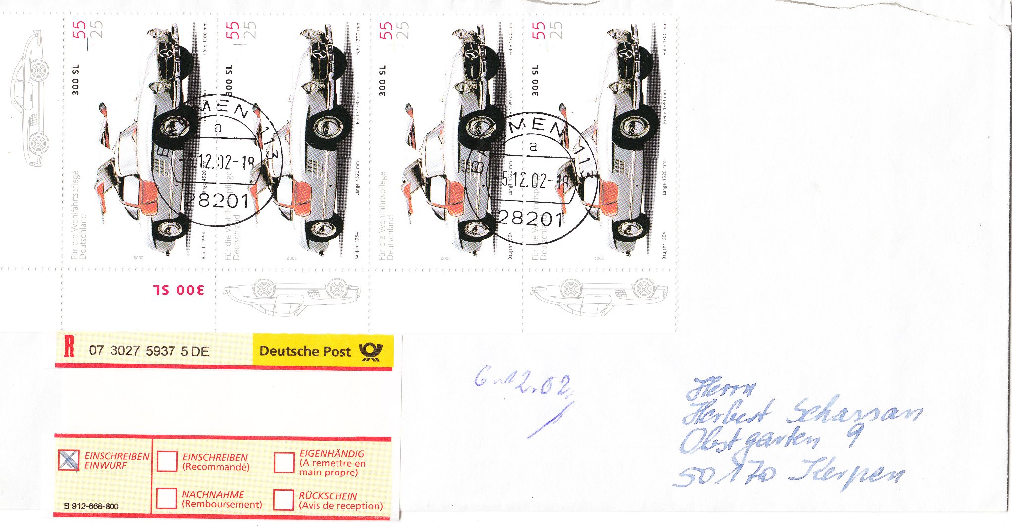 Diese Wohlfahrtsmarke aus dem Jahre 2002 zeigt als Motiv den legendären "Flügeltürer" Mercedes 300 SL, hier gleich vier Stück vom Eckrand 1 auf um 11 Cents überfrankiertem Standardbrief (56 Cents) per Einwurfeinschreiben (1,53 €):