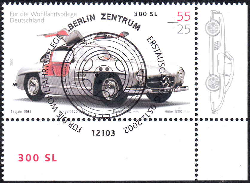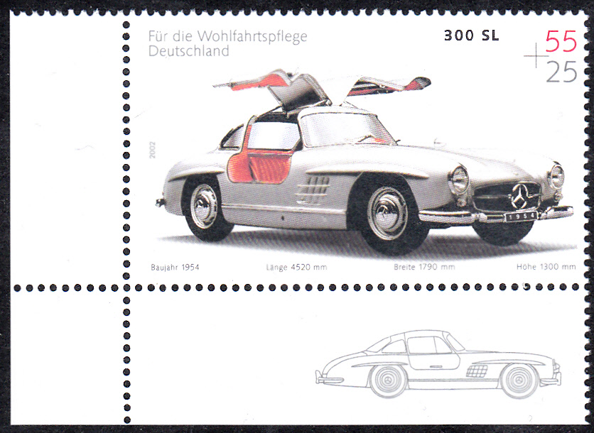 Auf den Bogenränder dieser Marke mit dem Mercedes 300 SL aus dem Jahre 1954 (MiNr 2291) sind mit Zeichnungen dieses Autos verziert. Hier eine Marke vom unteren Bogenrand.