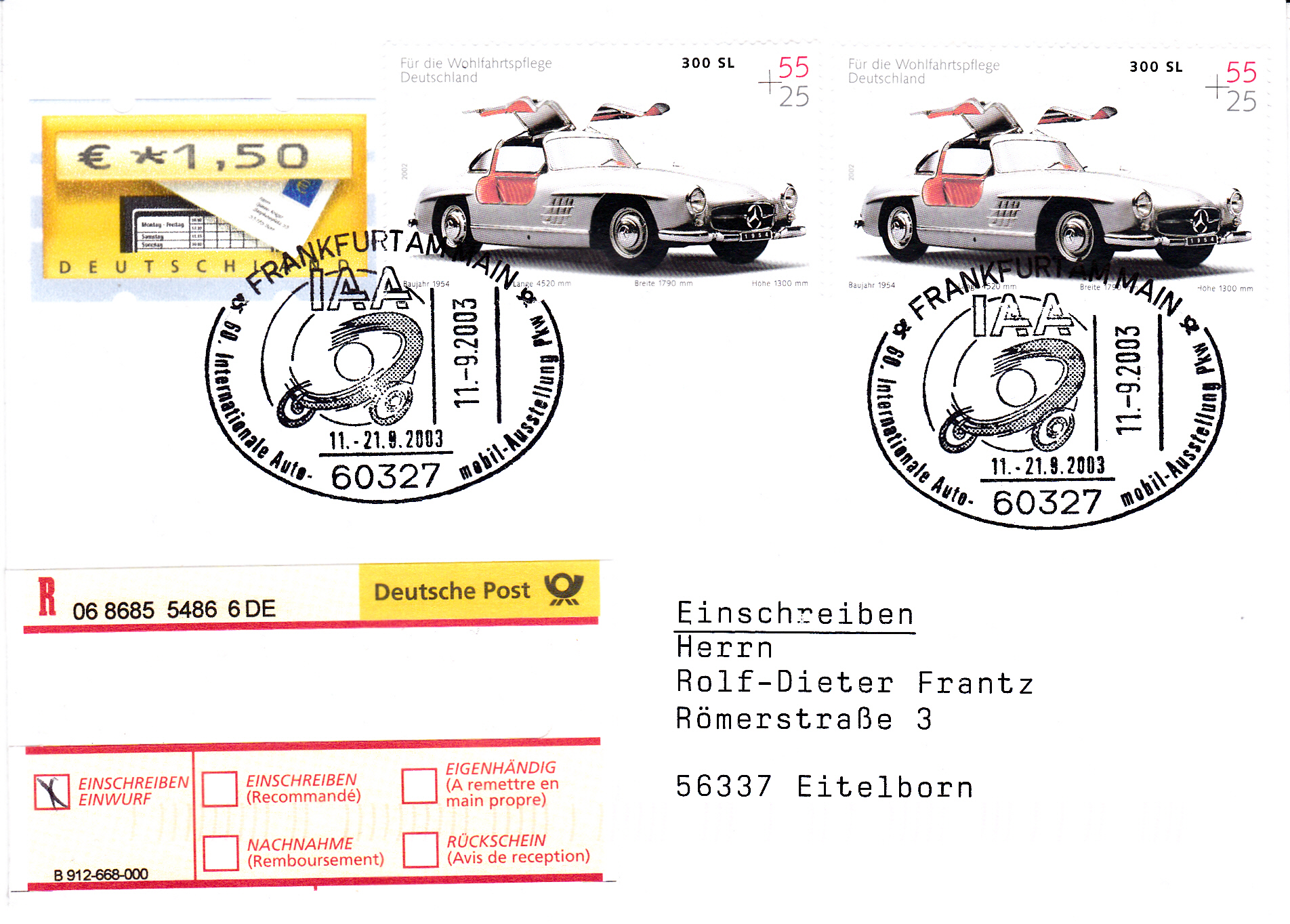 Brief als Einschreiben vom 11.9.2003 mit zwei Wohlfahrtsmarken mit dem Motiv "Mercedes 300 SL" (MiNr 2291) und einer Automatenmarke zu 1,50€ und einem thematisch passenden Sonderstempel aus Frankfurt zur 60. Automobil-Ausstellung. Das verklebte Porto beträgt: Brief bis 20 Gramm 55 Cent, die Zusatzleistung Übergabe-Einschreiben 205 Cent, zusammen 260 Cent. Angekreuzt wurde aber nur die Versandart Einwurf-Einschreiben!! Vermutlich ein Fehler des annehmenden Postler.