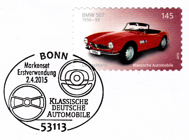 Für die nassklebende Version der Marke gab es in Bonn einen Ersttagsonderstempel mit der Abbildung eines BMW 507.