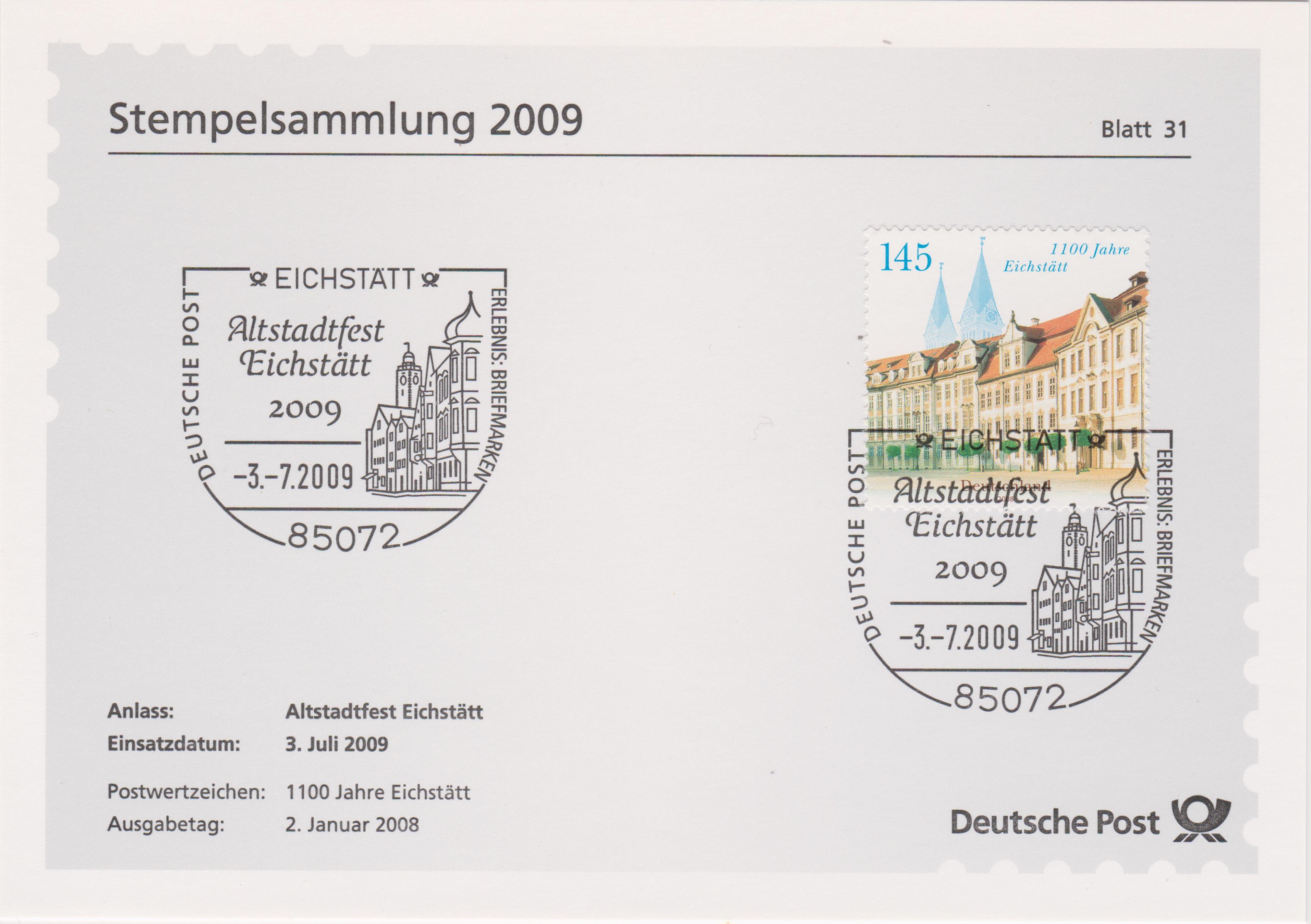 Deutsche Post MiNr. 2638, erschienen am 02.01.2008 aus Anlass "1100 Jahre Eichstätt", hier mt passendem Sonderstempel vom 03.07.2009 zum "Altstadtfest Eichstätt 2009" auf Blatt 31 der "Deutsche Post Stempelsammlung 2009":