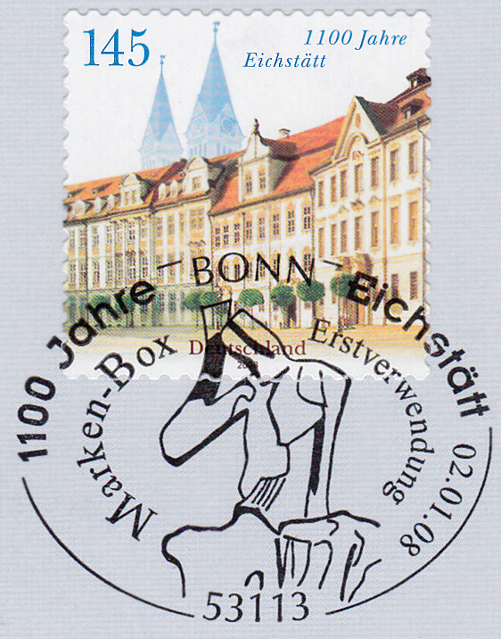 Hier zeige ich eine postfrische Marke "1100 Jahre Eichstätt" (MiNr 2638). Sie zeigt den Residenzplatz und den Dom in Eichstätt.
