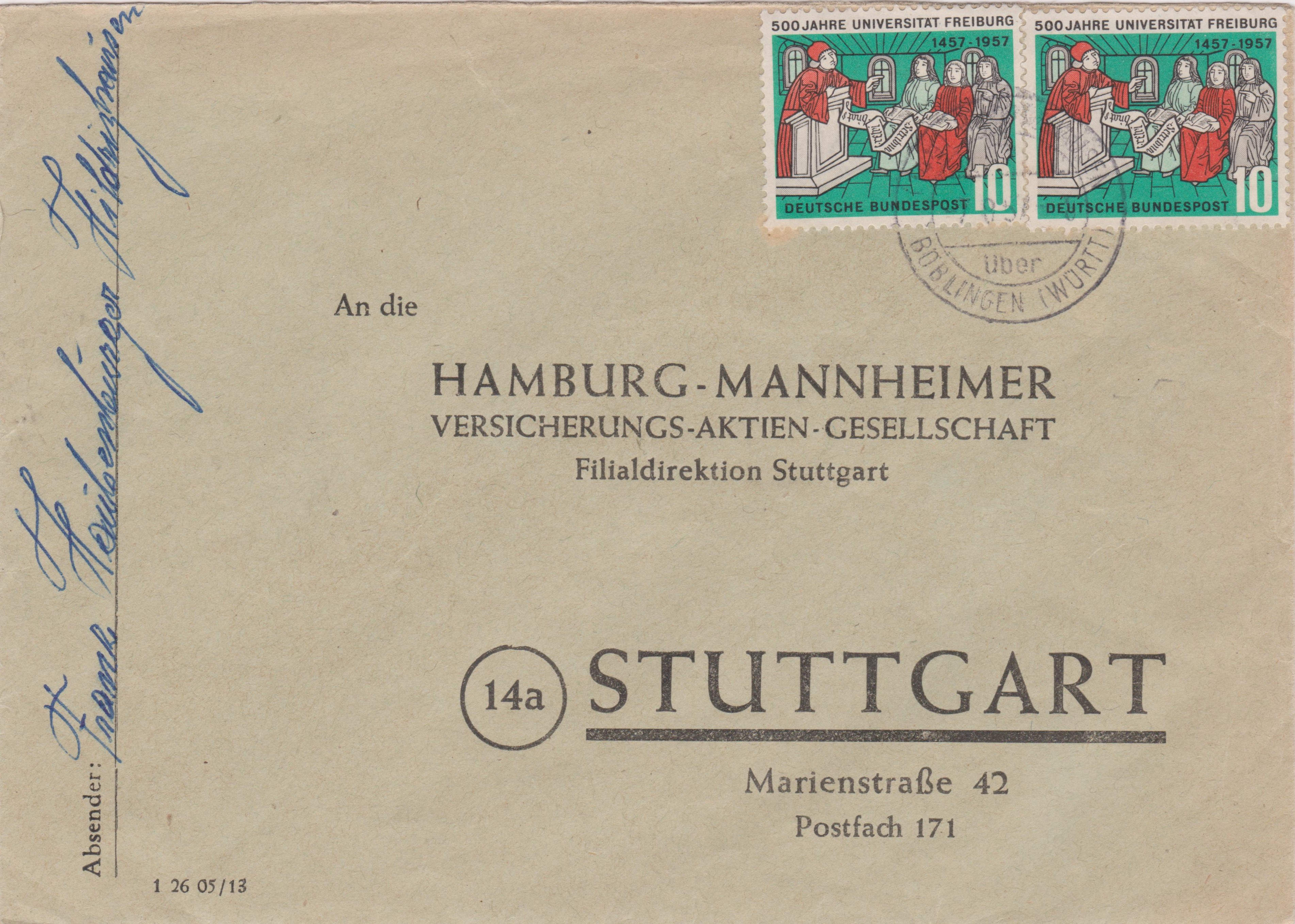 Bund MiNr. 256 erschien 1957 im Jubiläumsjahr "500 Jahre Universität Freiburg", hier als portogerechte Mehrfachrankatur auf einen Fernbrief:
