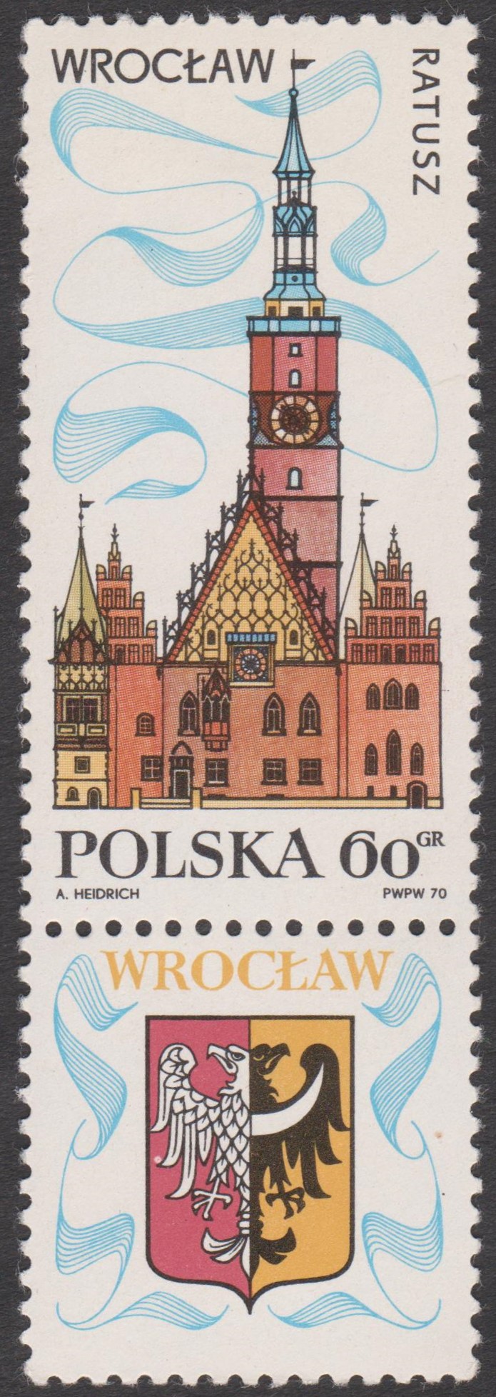 Polen MiNr. 2001 zeigt das Rathaus in Breslau, das Zierfeld zeigt das Stadtwappen von Breslau, wie es von 1948 bis zum Fall des Kommunismus 1990 galt: