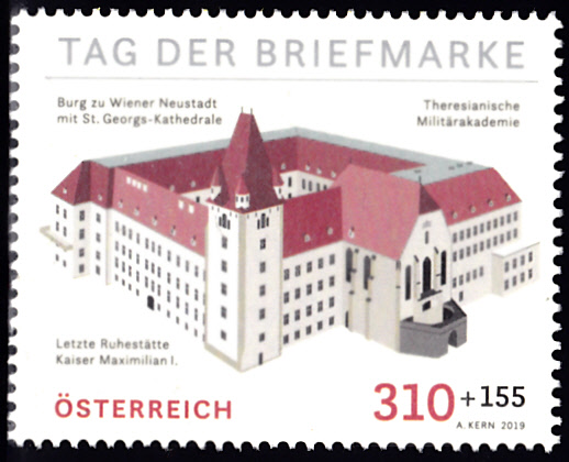Auf dieser Marke aus Österreich (MiNr 3488) zum Tag der Briefmarke 2019 wird die Burg Wiener Neustadt gezeigt. Sie ist die letzte Ruhestätte von Kaiser Maximilian I..