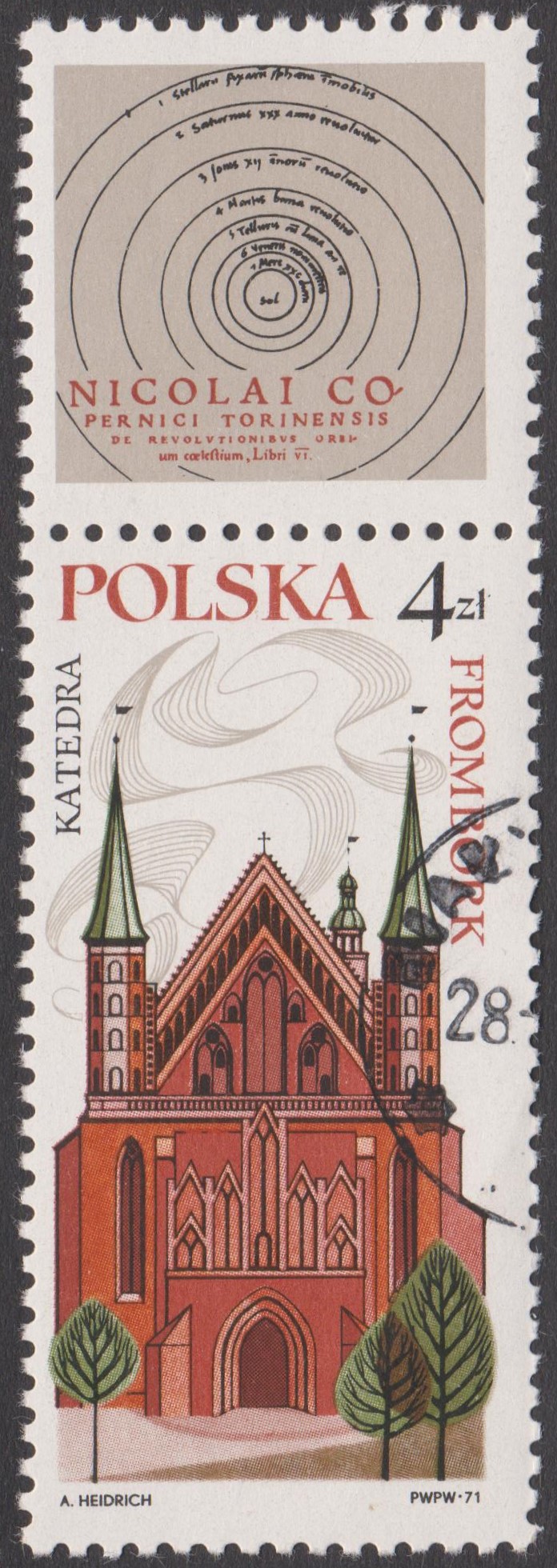 Polen MiNr. 2091 stellt die Kathedrale dar, das Zierfeld heliozentrische Kreise: