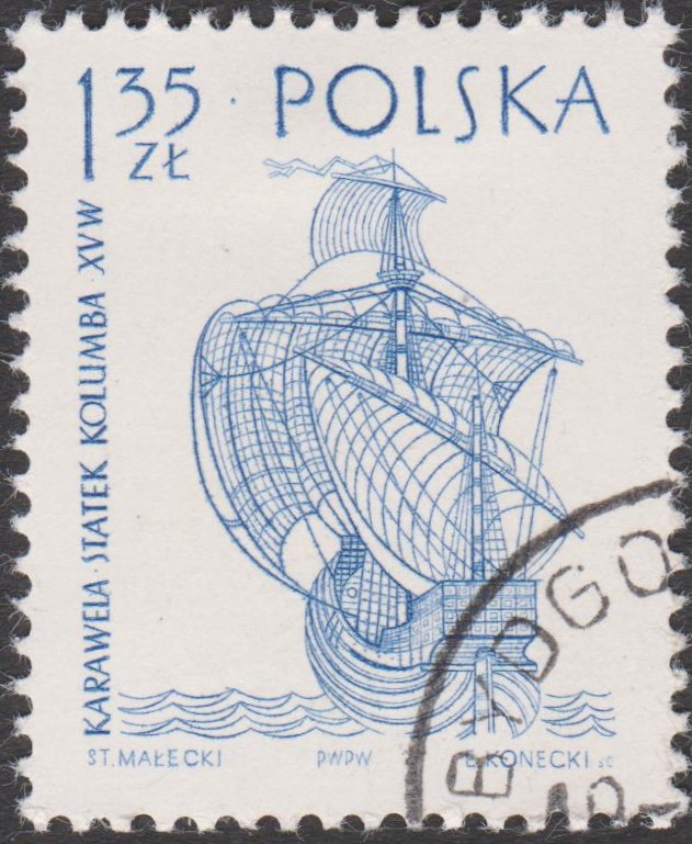 Polen MiNr. 1465 zeigt ein Kreuzritter-Segelschiff aus dem 15. Jahrhundert nach einem Holzschnitt von Erhard Reuwich aus dem Buch von Bernhard von Breydenbach (um 1440-1497) "Pilgerreise ins Heilige Land":