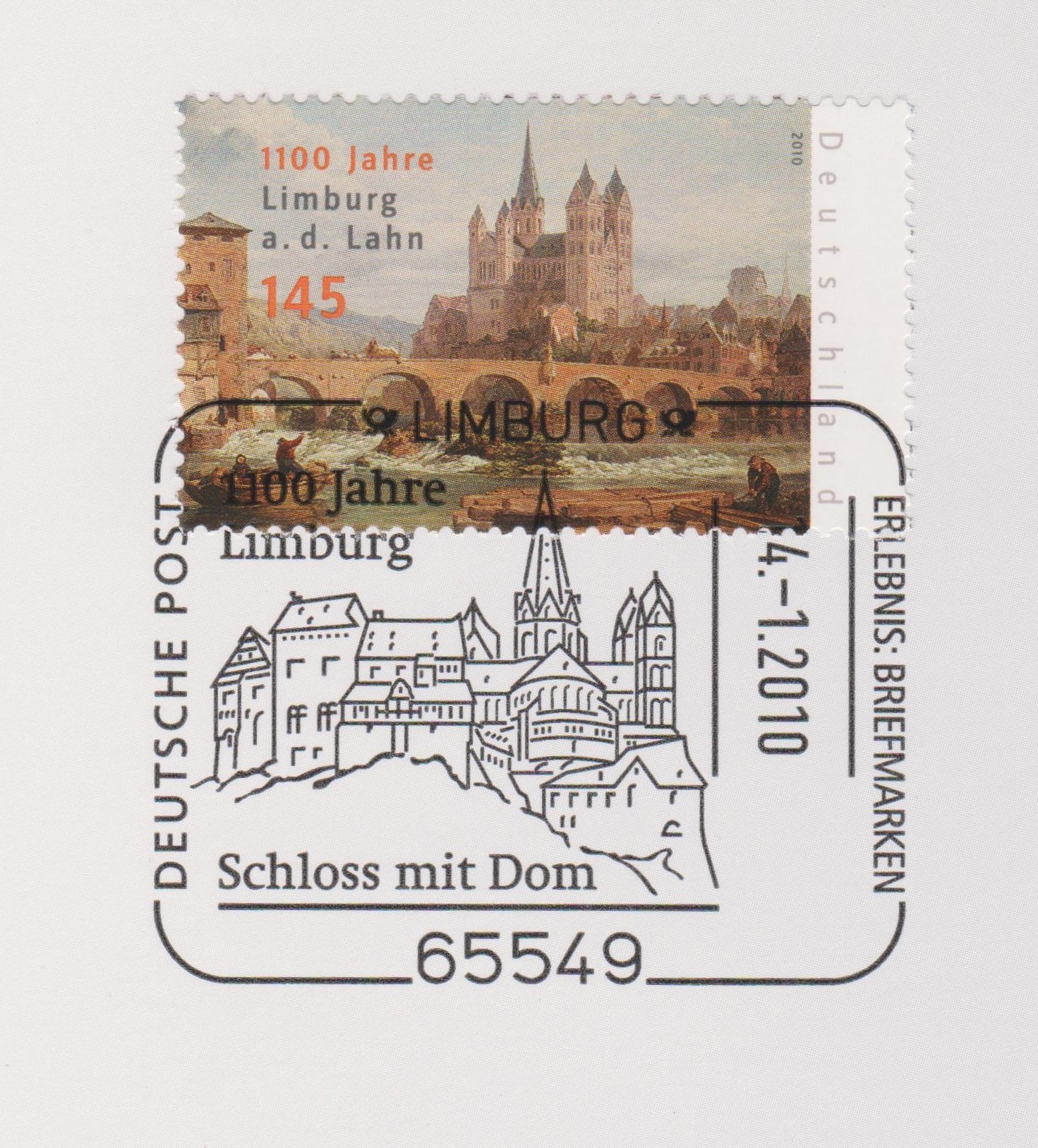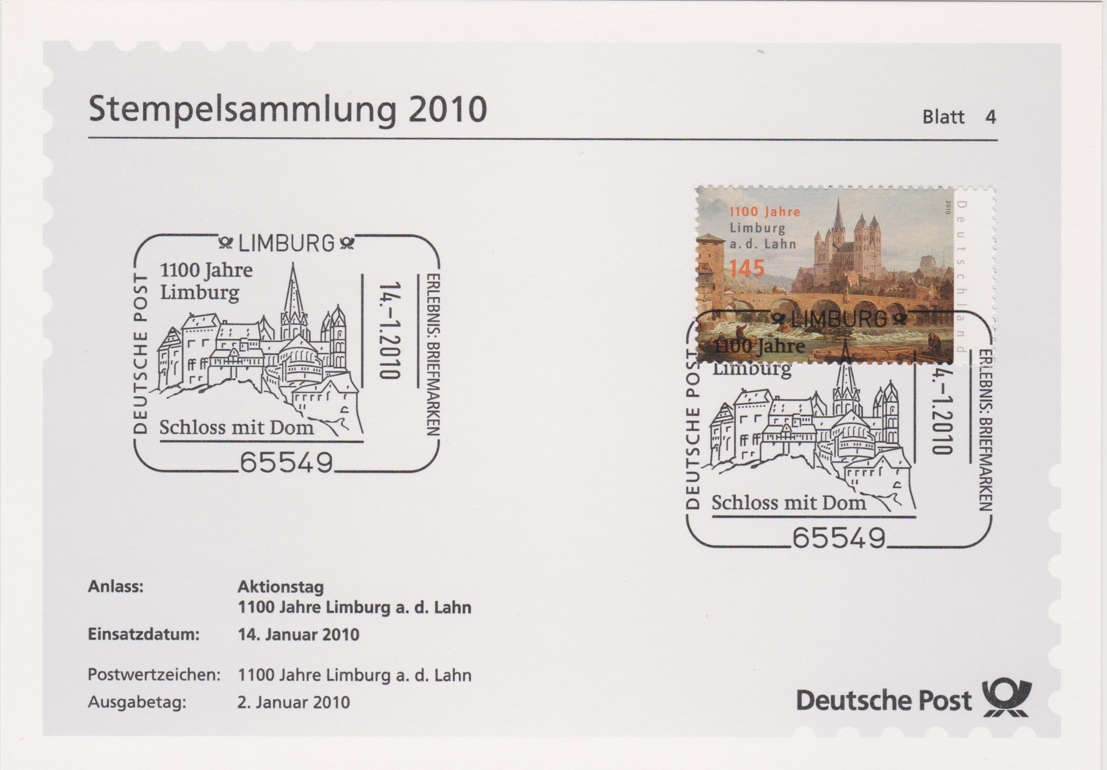 Am 02.01.2010 erschien diese Sondermarke "1100 Jahre Limburg", hier am "Aktionstag 14.01.2010" mit passendem Sonderstempel entwertet auf Blatt 4 der Deutsche Post Stempelsammlung 2010:
