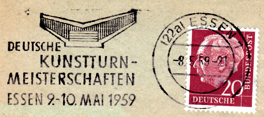 Maschinenwerbestempel aus (22a) Essen vom 8.5.1959 zu den Deutschen Kunstturnmeisterschaften in Essen am 9.-10.Mai 1959.