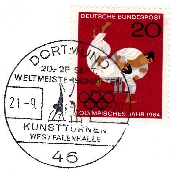 Dieser Sonderstempel aus Dortmund vom 21.9.1966 wurde anlässlich der Weltmeisterschaften im Kunstturnen vom 20.-25.9.1966 eingesetzt.