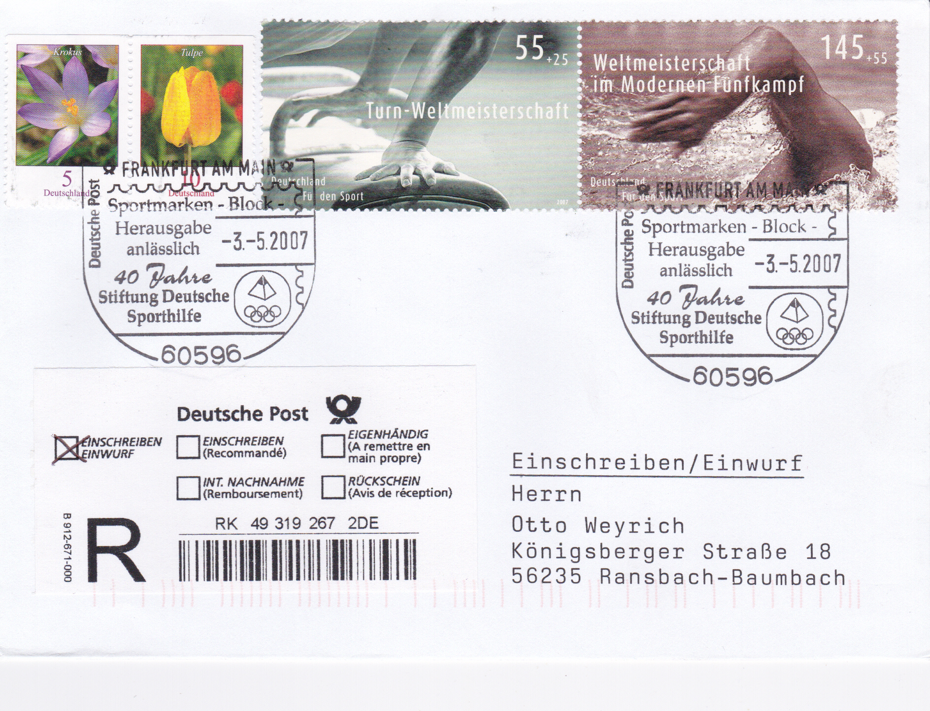 Einwurf-Einschreiben mit einem Zusammendruck der Marken zu den Turn-Weltmeisterschaften 2007 (MiNr 2586) und den Weltmeisterschaften im Modernen Fünfkampf (MiNr 2587) aus dem Block (MiNr Block 70) und einem Zusammendruck von zwei Marken der DS Blumen zu 5Pf und 10Pf (MiNr 2480 Do und 2484 Do) aus dem Zusammendruck-Kleinbogen und dem Sonderstempel zu "40 Jahre Stiftung Deutsche Sporthilfe" vom 3.5.2007 (Ersttag der Blockmarken) aus Frankfurt am Main. Das Porto setzt sich wie folgt zusammen: Standardbrief bis 20g 55 Cent, Übergabeeinschreiben 160 Cent zusammen 215 Cent.