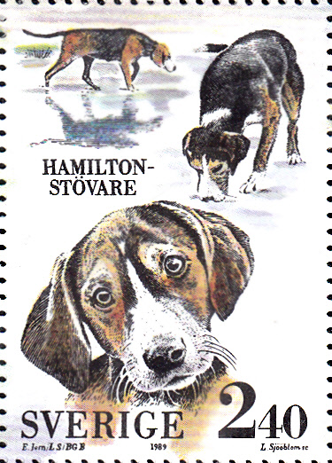 Diese Marke aus Schweden (MiNr 1570) zeigt drei Bilder zum Hamiltonstövare.