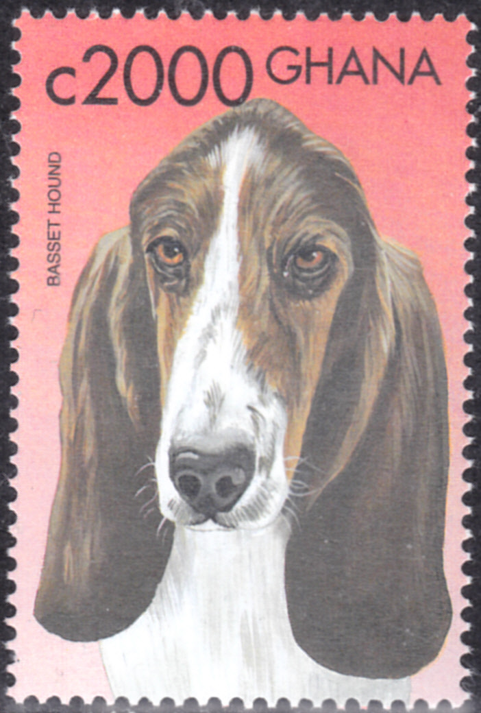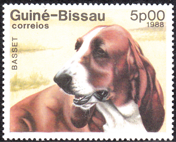 Auf dieser Marke aus Guinea-Bissau (MiNr 959) wird der Kopf eines Basset gezeigt.