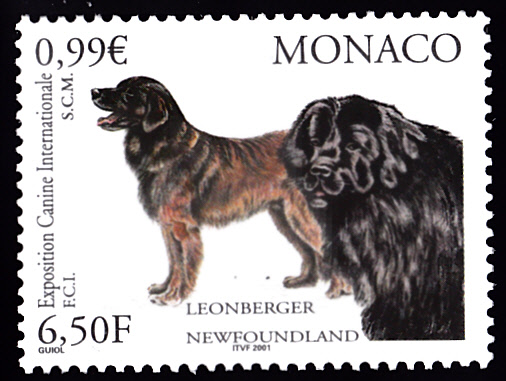 Aus Monaco kommt diese Marke (MiNr 2548) zur Internationale Hundeausstellung in Monte Carlo mit einem Neufundländer (rechts).