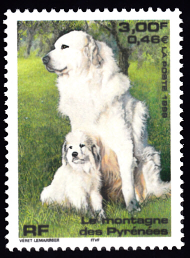 In einer Serie "Haustiere" ist in Frankreich diese Marke (MiNr 3426) mit einem Pyrenäenberghund mit Nachwuchs erschienen.