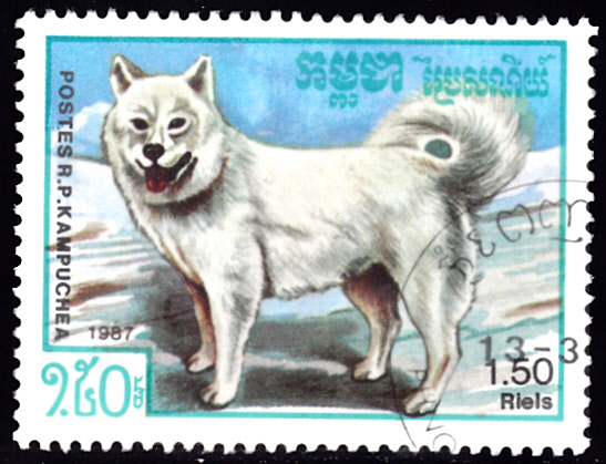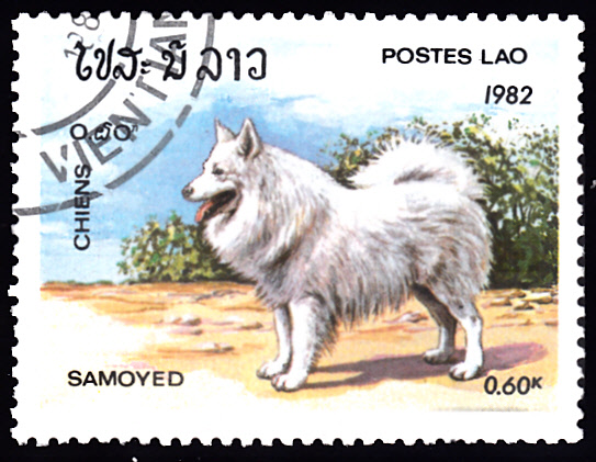 Auf einer Marke au Laos (MiNr 574) wird ein Samojede vorgestellt.