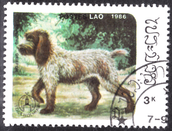 Auf dieser Marke aus Laos (MiNr 947) ist ein Griffon d’arrêt à poil dur – Korthals abgebildet.