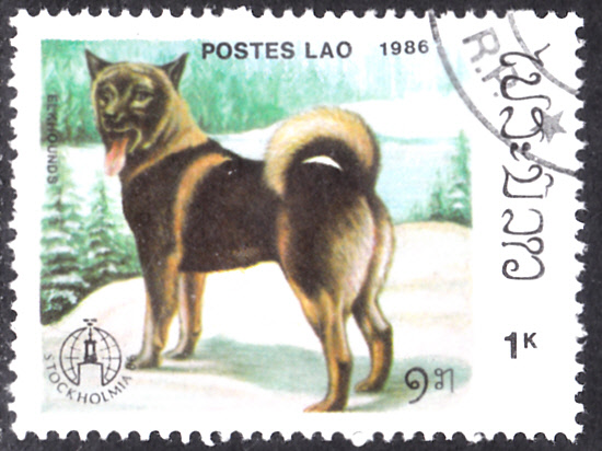 Auf dieser Marke aus Laos (MiNr 945) zur Internationalen Briefmarkenausstellung STOCKHOLMIA ’86 in Stockholm ist vermutlich ein Norwegischen Elchhund abgebildet.