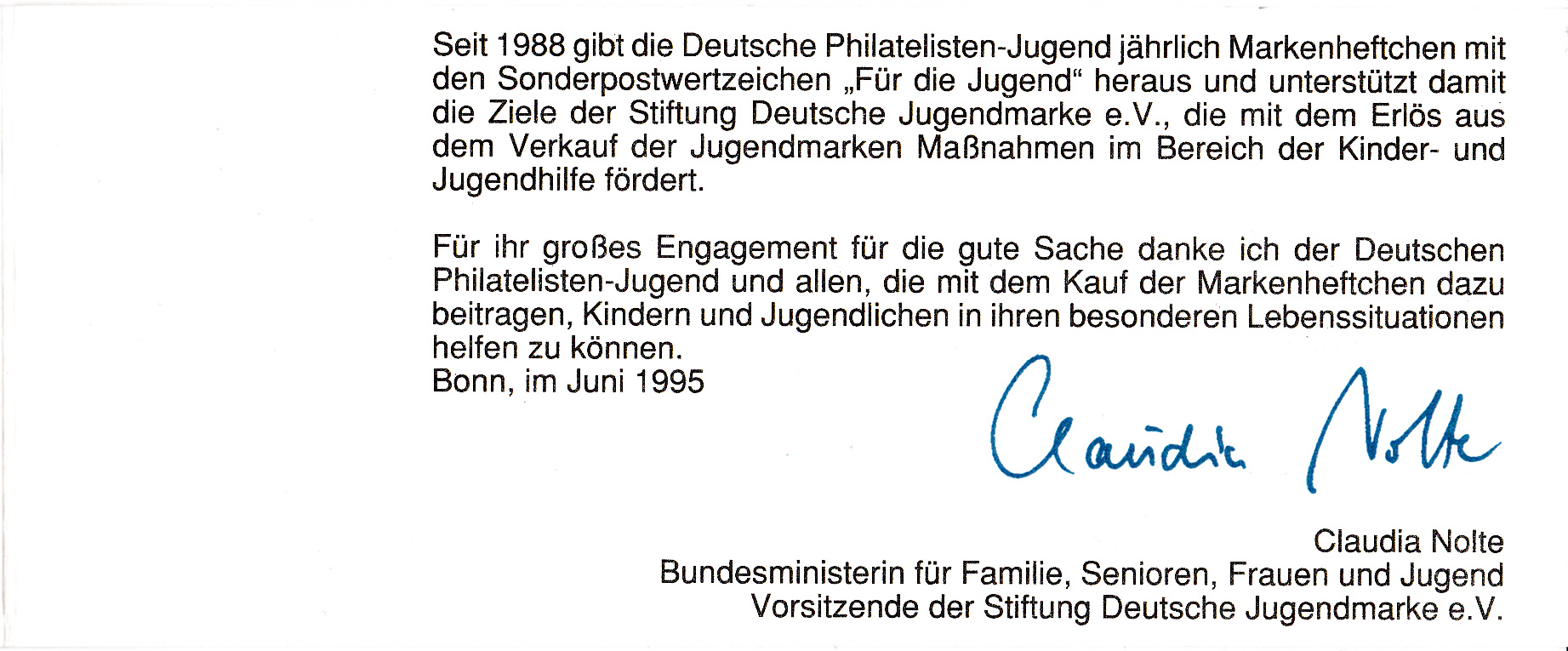 Von dieser Marke gibt es auch ein privates Markenheftchen, das die Deutsche Philatelisten Jugend für die Stiftung Deutsche Jugendmarke e.V. herstellte.