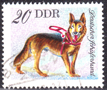 Auch in der DDR ist eine Marke (MiNr 2157) mit einem Deutschen Schäferhund erschienen. Der abgebildete Hund ist offenbar als Rettungshund beim Roten Kreuz ausgebildet worden.