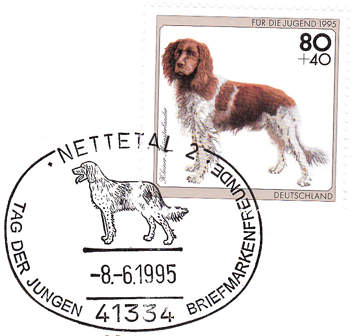 Sonderstempel aus Nettetal zum Tag der Jungen Briefmarkenfreunde vom Ersttag dieser Marke mit einem Kleinen Münsterländer im Stempelbild (passend zum Motiv der Marke).