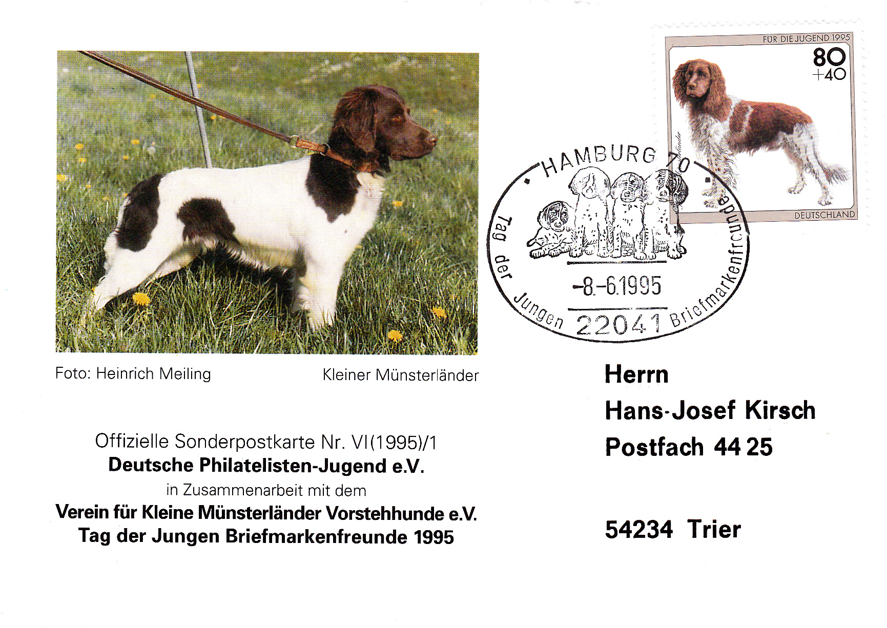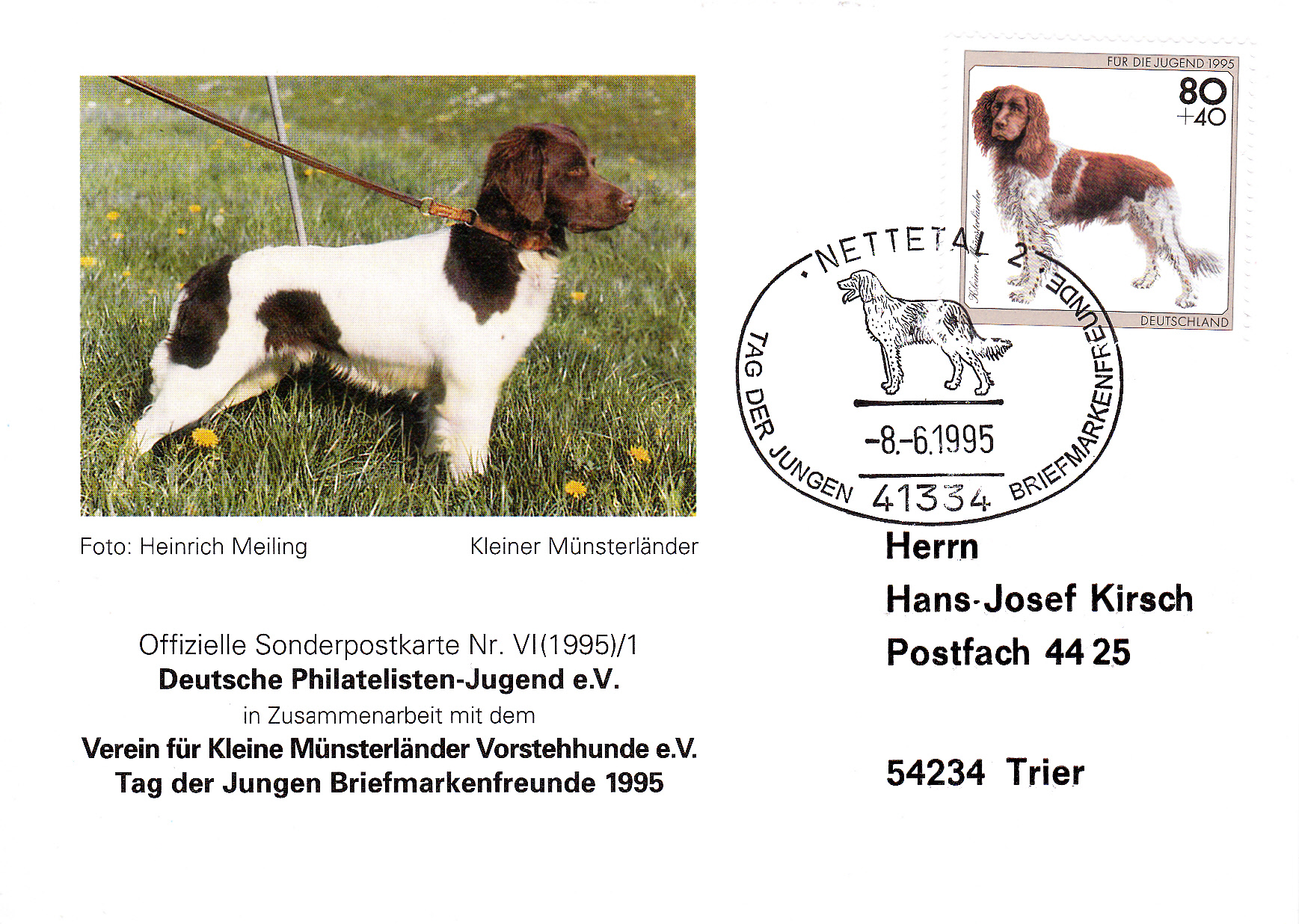 1995 erschien in der Serie "Für die Jugend" der Deutschen Bundespost auch eine Marke (MiNr 1797) mit einem Kleinen Münsterländer.