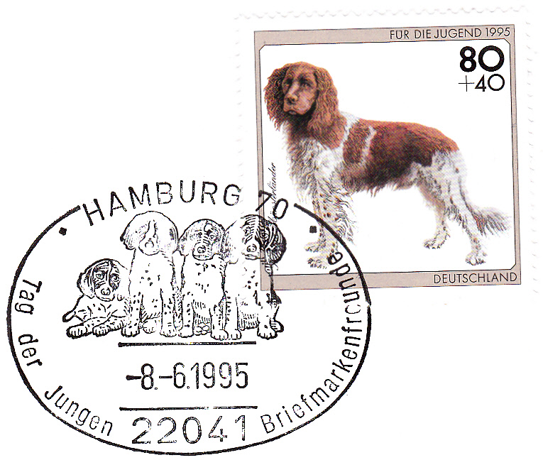 Sonderstempel aus Hamburg 70 zum Tag der Jungen Briefmarkenfreunde vom Ersttag dieser Marke mit vier Welpen des Kleinen Münsterländer im Stempelbild.