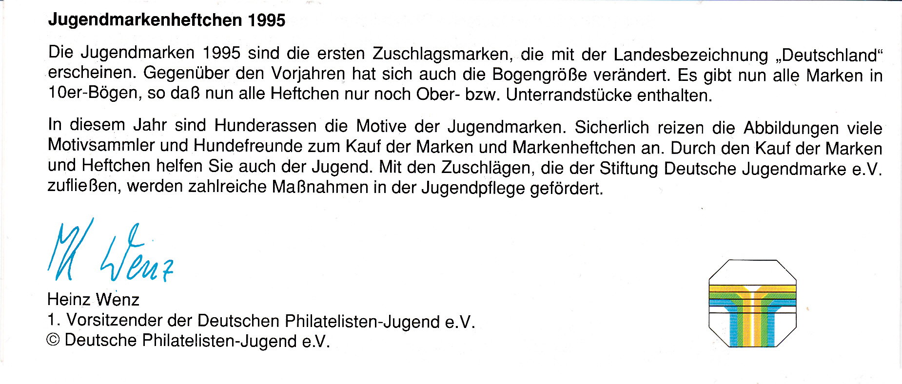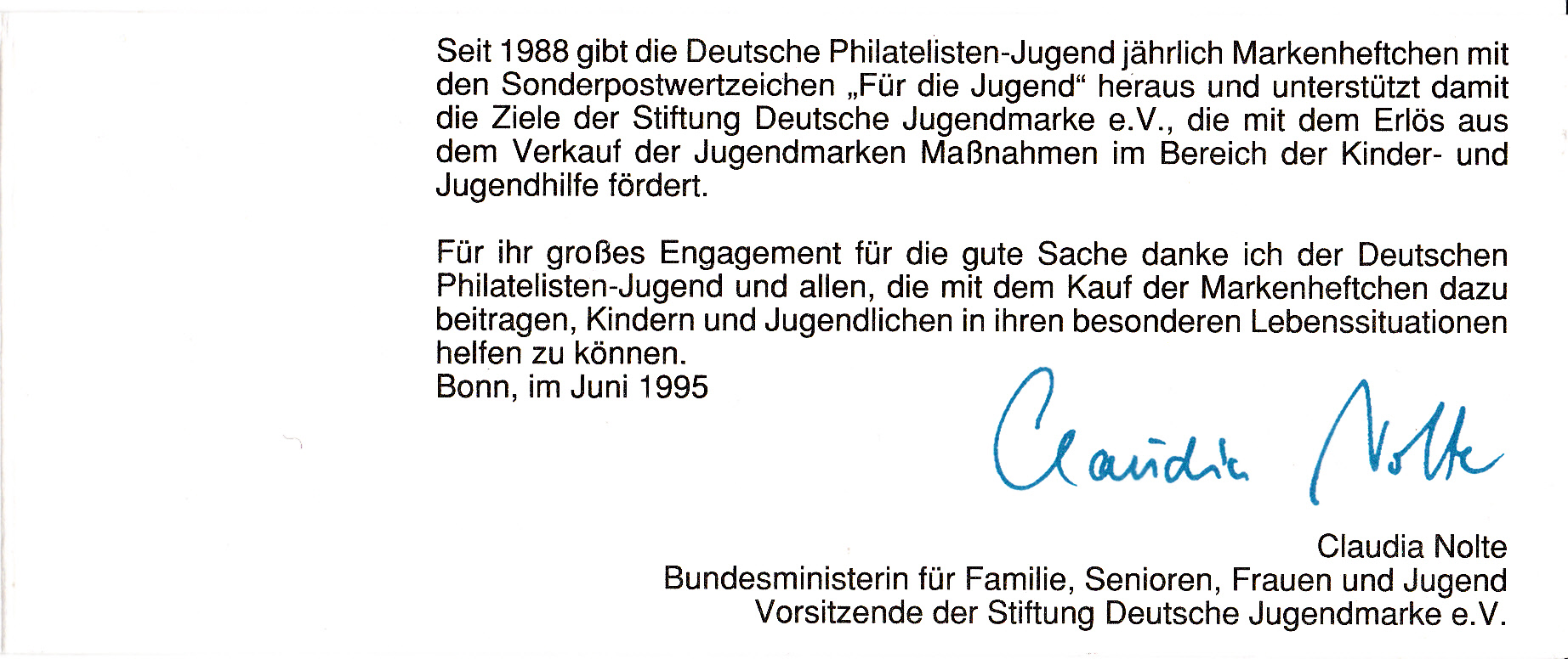 Von dieser Marke gibt es auch ein privates Markenheftchen, das die Deutsche Philatelisten Jugend für die Stiftung Deutsche Jugendmarke e.V. herstellte.