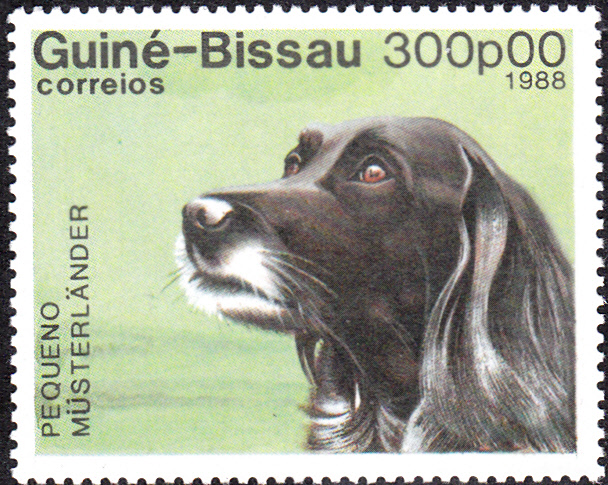 Auf dieser Marke aus Guinea-Bissau (MiNr 963) ist der Kopf eines Kleinen Münsterländer zu sehen.