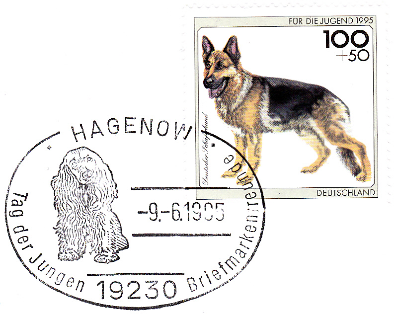 Sonderstempel vom 9.6.1995 aus Hagenow zum Tag der Jungen Briefmarkenfreunde mit einem Cocker Spaniel im Stempelbild.