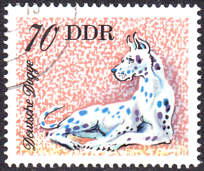 Auf dieser Marke aus einer Serie der DDR (MiNr 2160) ist eine Deutsche Dogge abgebildet.