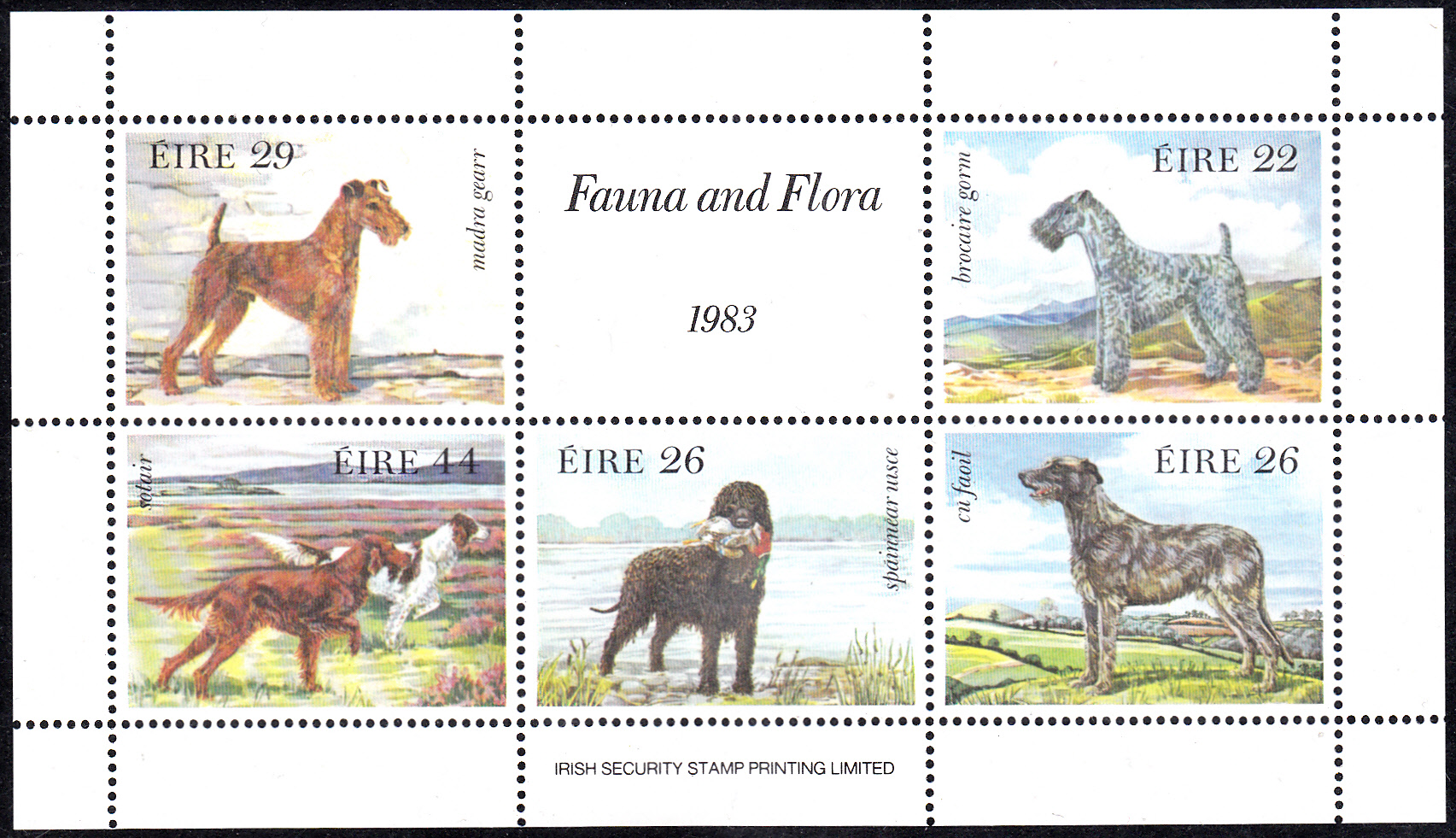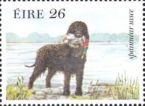 Der Irish Water Spaniel ist ein anerkannte irische Hunderasse. Er wird bis zu 59cm groß. Sein Fell ist von Natur aus fettig und hat eine sehr satte, dunkelbraunrote Leberfarbe. Der Irish Water Spaniel auf dieser Marke aus Irland (MiNr 512) trägt eine Ente in seinem Maul.