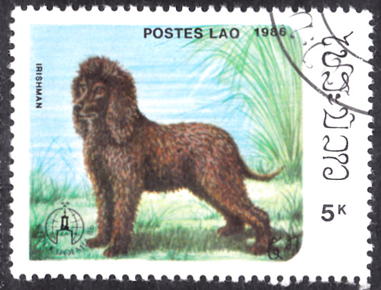 Auffallend ist sein lockiges, kastanienbraunes Haarkleid, seine Ringellöckchen und sein "Rattenschwanz", der zum großen Teil glatt und beinahe nackt erscheint. Auch diese Marke aus Laos (MiNr 949) bildet einen Irish Water Spaniel ab.