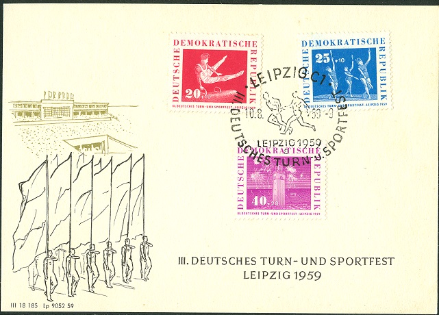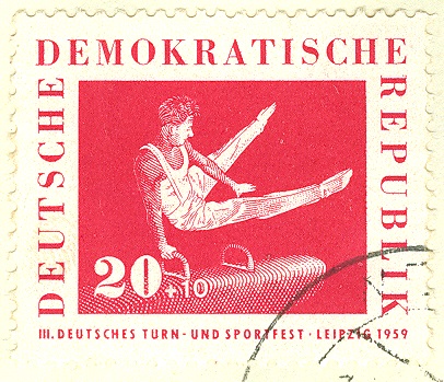 Eine Marke der DDR-Ausgabe zeigt einen Sportler am Seitpferd. Die MiNr. 709 (20 + 10 Pfennig, lilarot) erschien am 10. August 1959 anlässlich eines Turn- und Sportfestes in Leipzig/Sachsen.
