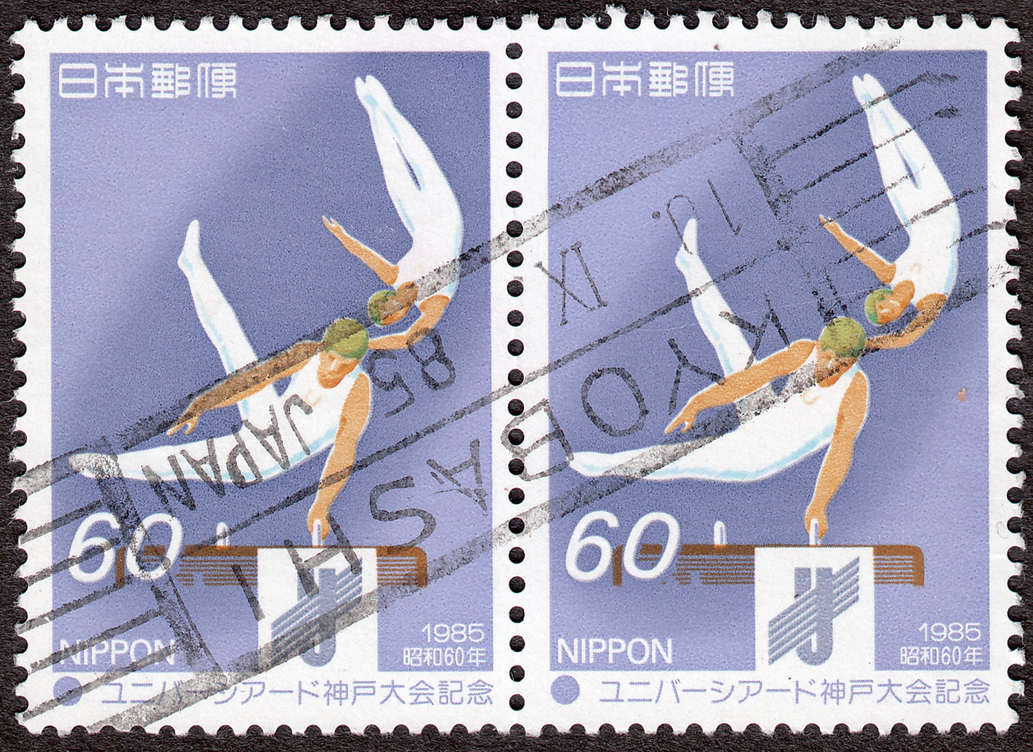 Briefmarke mit einem Turner am Seitpferd aus Japan, hier gleich im waagerechten Paar: