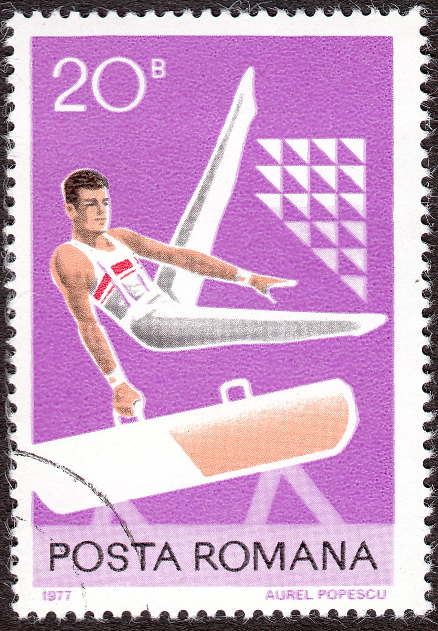 Freischwebender Künstler am Pauschenpferd aus Rumänien (MiNr 3467):