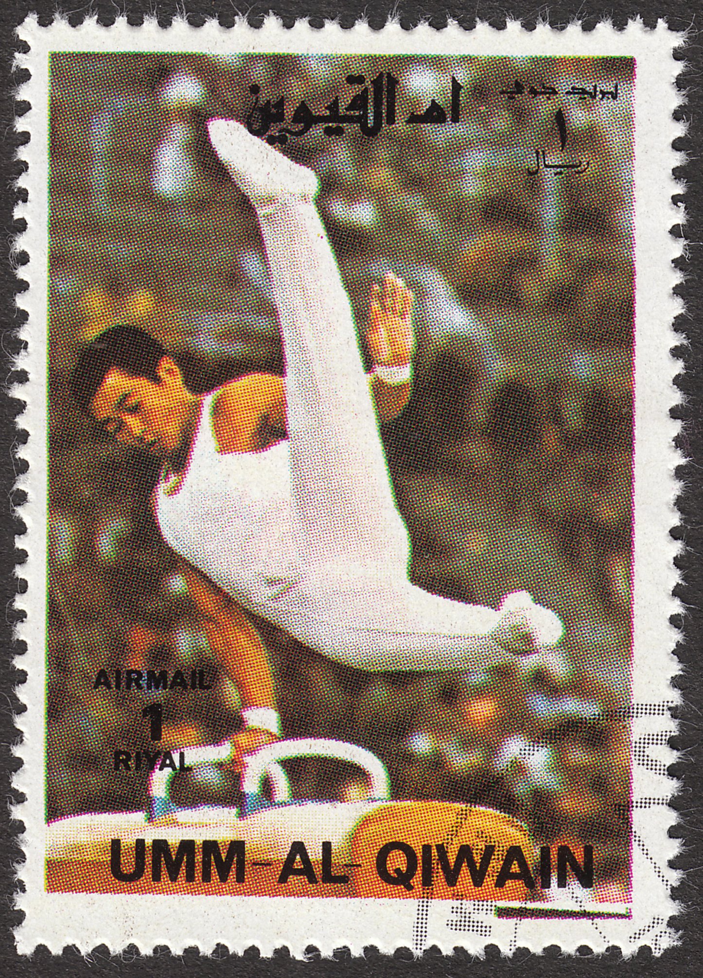 Hier eine Marke aus dem Emirat "UMM AL QIWAIN" mit einem Turner am Seitpferd: