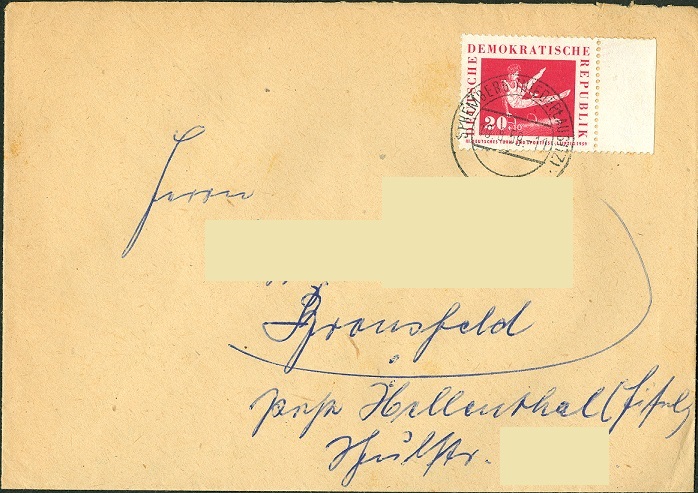 Die eingangs bereits gezeigte Marke als EF und Ersttagsdatum (10.8.1959).